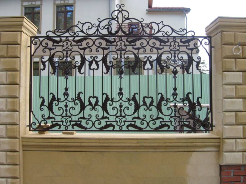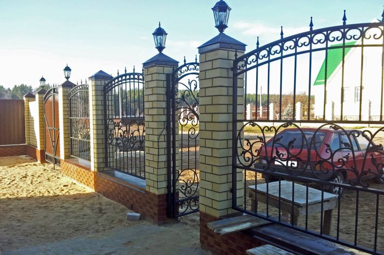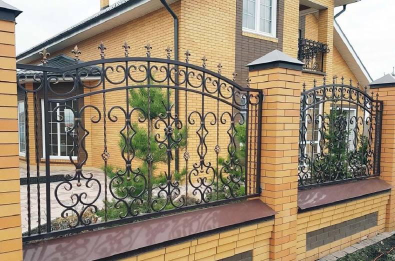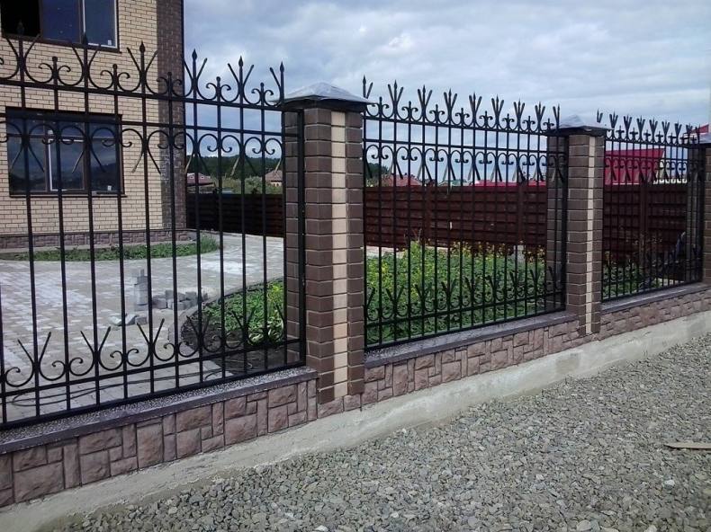 - Коваными элементами. Недостатком такого забора является полная доступность участка для изучения. Исправить ситуацию позволяет размещение металлических элементов в верхней части забора или вблизи ворот.
