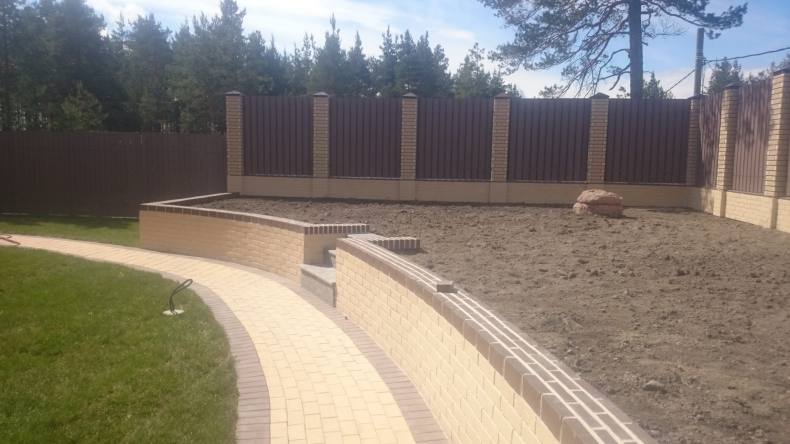 Дополнительную стильность и элегантность придадут участку заборы из лимонного кирпича, а сочетания темных и светлых тонов создадут неповторимый вау-эффект, объединяющий лаконичность и изысканность.