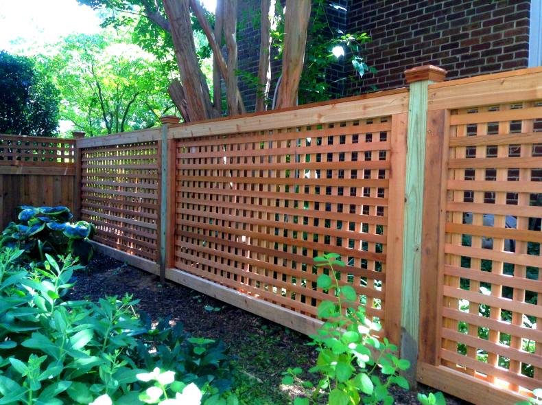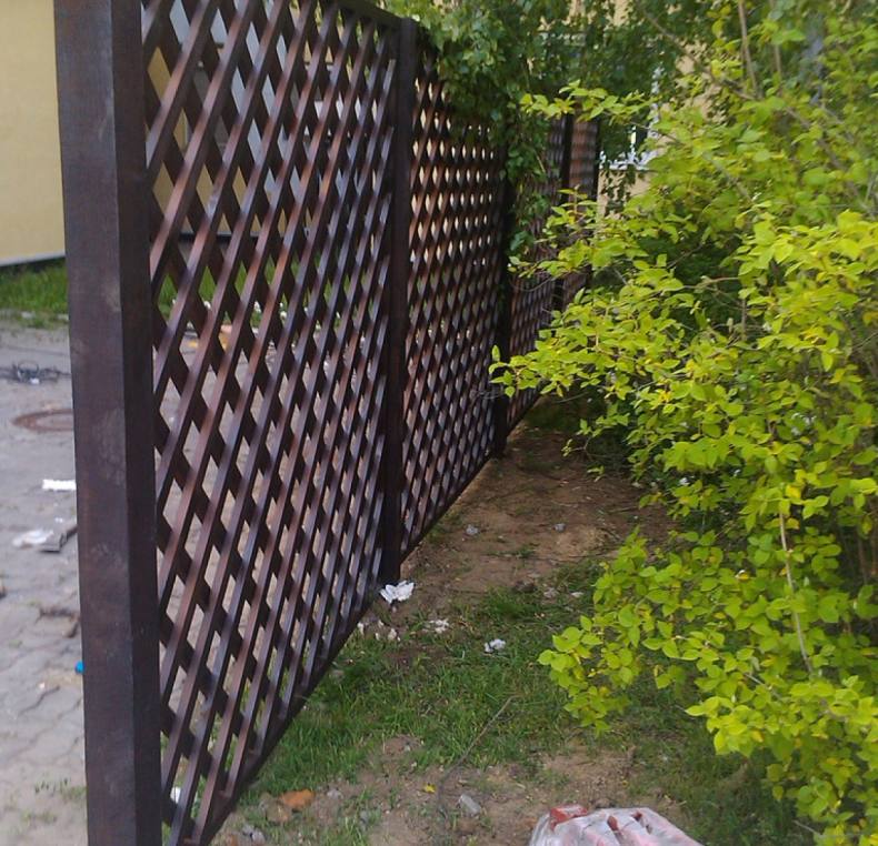 - Решетка – один из наиболее популярных вариантов декоративных заборов, изготовленных из дерева. В данном случае может иметь место разнообразное расположение досок (как горизонтально, так и под незначительным наклоном).