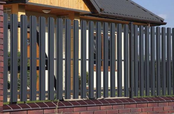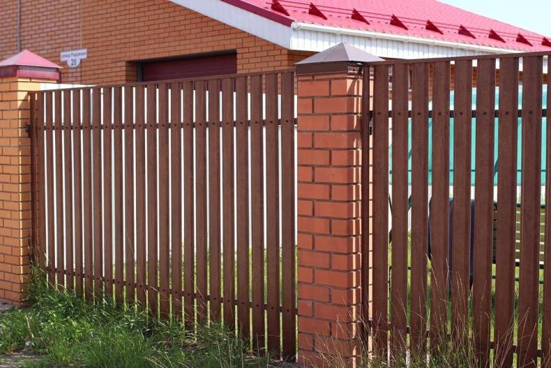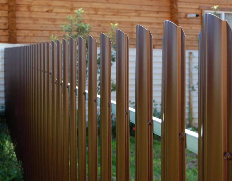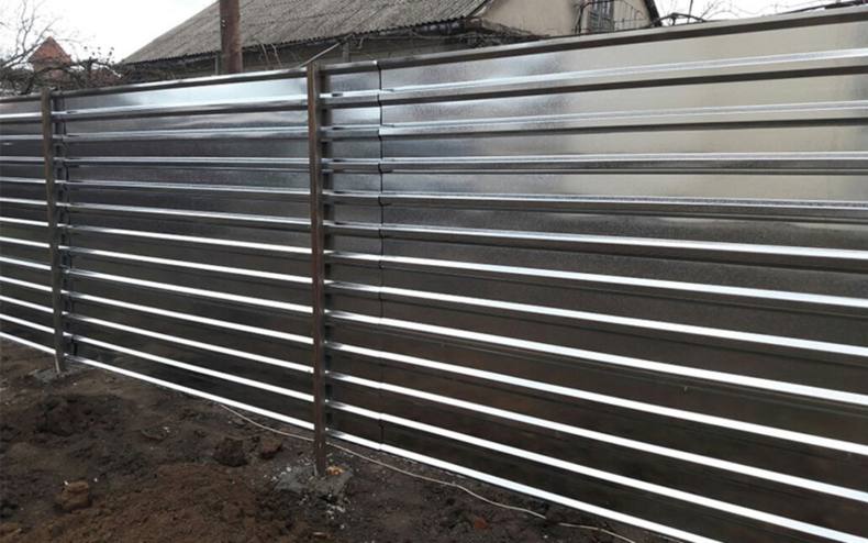 Для такого забора применяют металлические столбы и до трёх поперечин, изготовленных из прямоугольного металлического проката. Крепление саморезами, которые имеют резиновые шайбы.