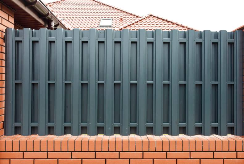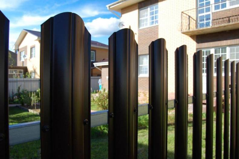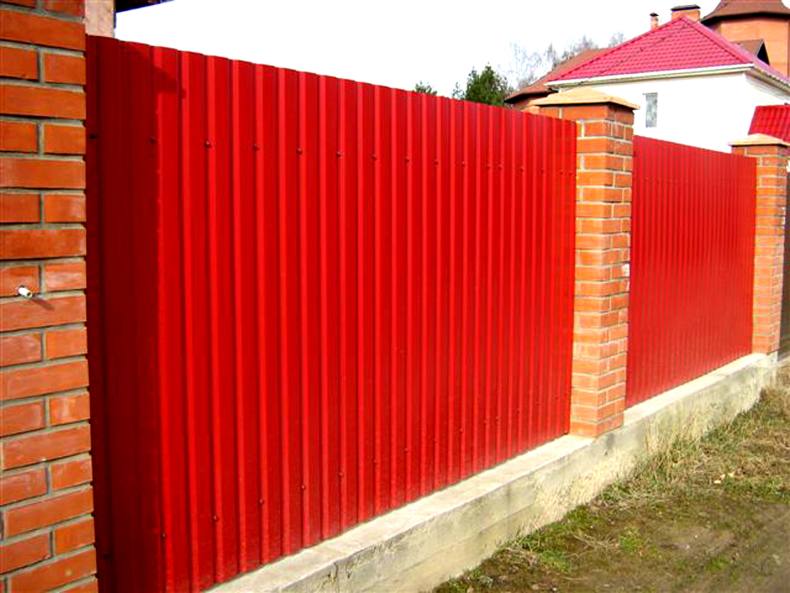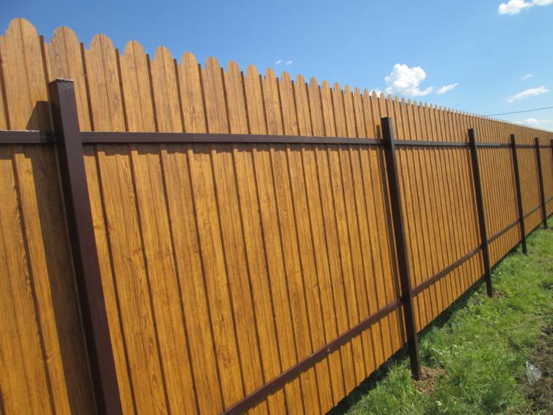 Один из наиболее применяемых материалов. Имеет форму волны в виде трапеции. Идеально подходит для перекрытия больших площадей и применяется в сложных формах забора.