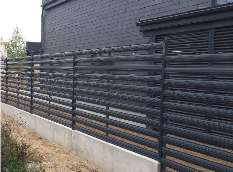 Размеры металлических планок позволяют и поперечное размещение (параллельно грунту), в один и в два ряда. Фото забора из горизонтальных элементов демонстрирует нетривиальность такого решения, ограждения бывают с просветами и глухие. Однако удешевить изгородь не получится — потребуется дополнительно устанавливать опоры, чтобы повысить прочность каркаса забора.
