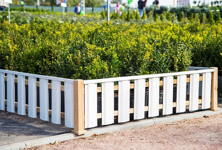 Классического белого цвета с заостренными краями и небольшой высоты или любым невысоким штакетником, выбранным и расположенным по приоритетам владельца участка.