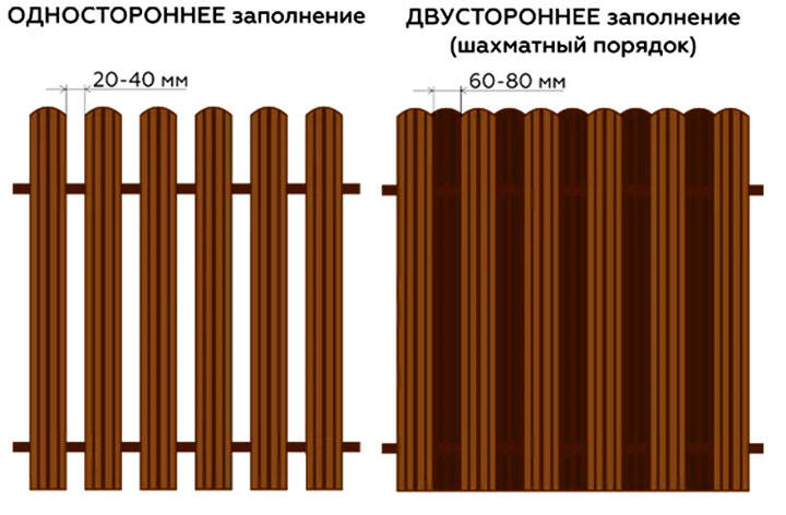 Расстояние между планками ничем не регламентировано, однако считается, что больше 5 см удаления удешевляет внешний вид. Для глухой изгороди можно его минимизировать или использовать двухстороннюю шахматку. Количество крепежных элементов зависит от высоты, число планок определяется по формуле: ширина штакетины плюс зазор/ на 100 см.