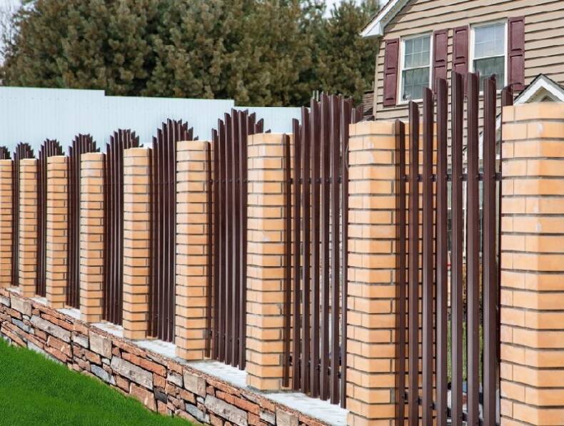 Красиво смотрятся кирпичные столбы, кованые элементы, разноцветные и разные по высоте планки на декоративном основании (из кирпича и камня).