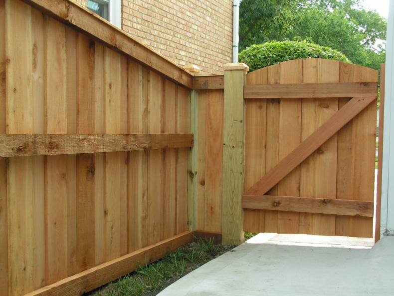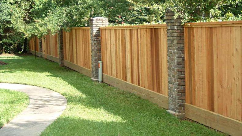 Глухое ограждение может состоять из различных секций или цельных конструкций между опорными столбами. При его возведении применяют древесину, металл, кирпич, бетон или натуральный камень.