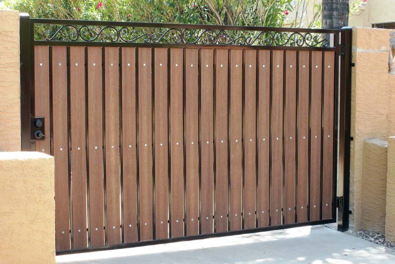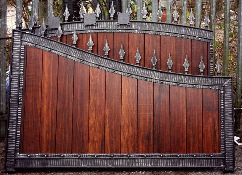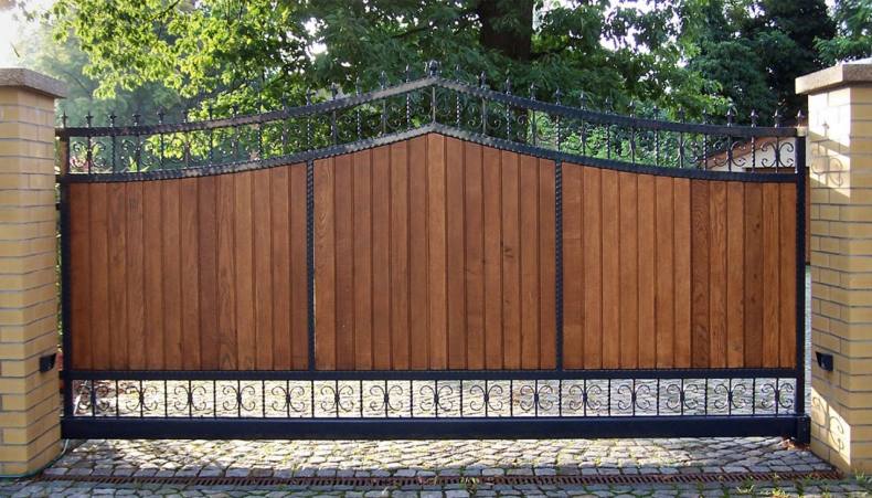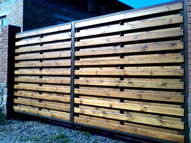 Деревянно-металлический забор представляет собой ряд металлических опор и полотна ограждения из деревянных элементов. Деревянные детали можно размещать вертикально или горизонтально по отношению к планкам, чтоб формировались преграды.