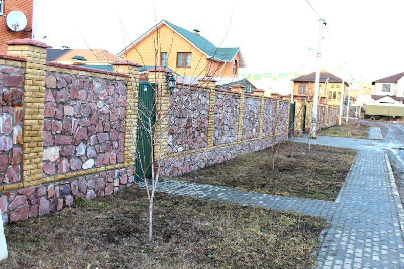 - Интересное сочетание евроштакетника и кирпича и т. д.