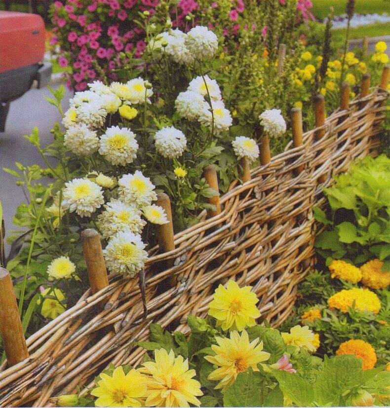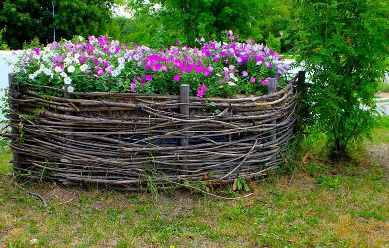 Плетень может выполнять декоративные функции. Им можно зонировать пространство на участке, например, отделяя огород от зоны отдыха. Он превосходно смотрится в компании клумб, особенно с вьющимися растениями: вьюнками, душистым горошком, клематисами. Колорит южных земель достигается при участии штокрозы и махровых сортов подсолнечника. А как же прекрасно он смотрится вместе с декоративными тыквами! Также невысоким плетнем можно оградить тропинку: чтобы гости не заблудились.