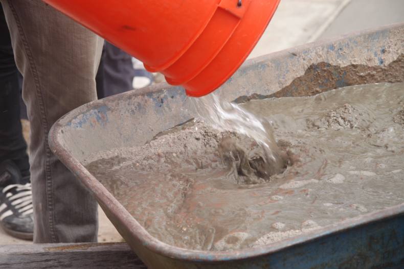 - Вливаем небольшое количество требуемого количества воды. Перемешиваем и постепенно добавляем всю воду. Ее должно быть в растворе в два раза меньше, чем цемента. Максимально допустимая пропорция воды и цемента – 1:1.