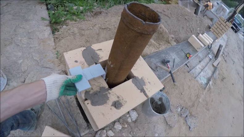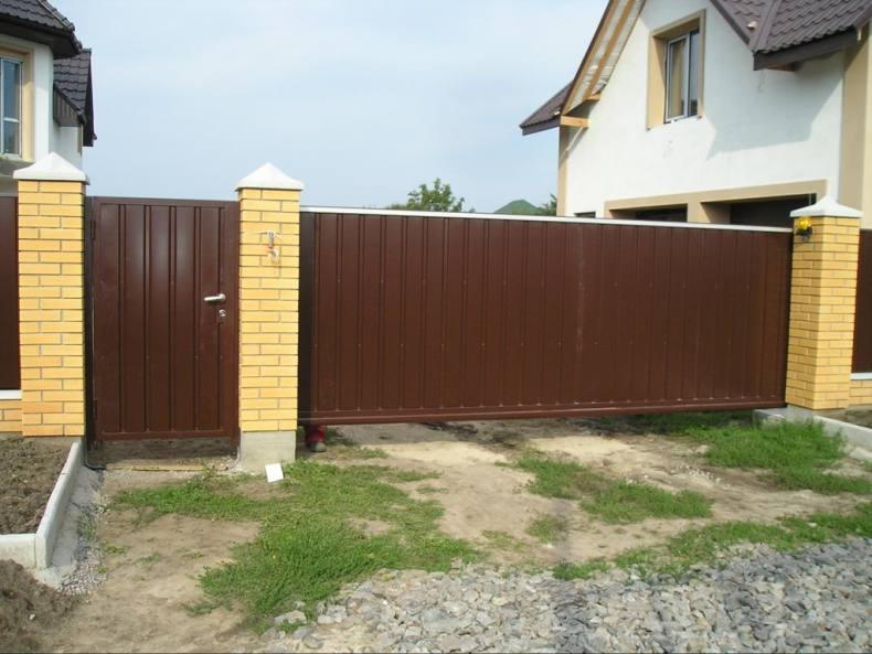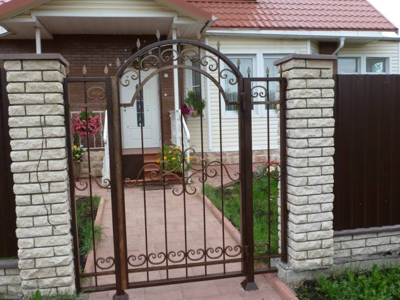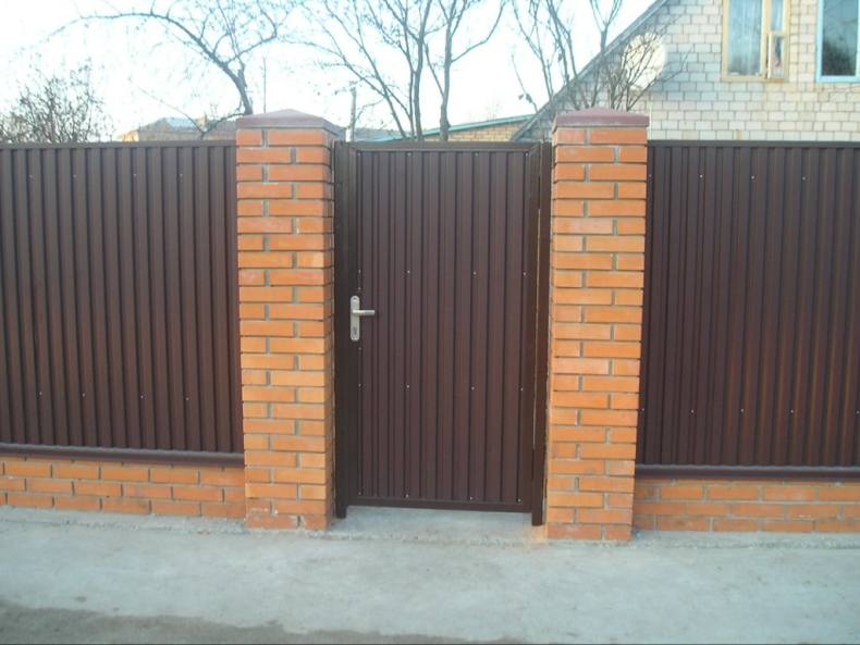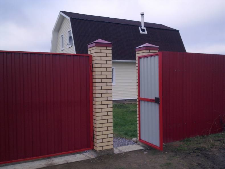 Самый высокоэффективный вариант опоры для калиток, это кирпичные столбы. Они выполняют две функции. Это- опорную и эстетическую. А также они хорошо гармонируют с калиткой из профлиста.