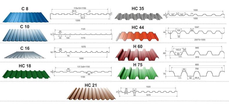 Листы профнастила отличаются между собой по диаметру и цене. Эти различия маркируются буквами: С, Н и НС. Где Н обозначает несущее полотно, необходимое для кровельных работ.