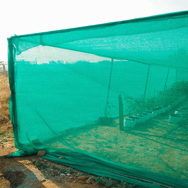 - Сетка с затемнением в 70-80% используется для наружной обивки теплиц. Так культуры, которые не любят заморозки, будут получать достаточно света, при этом не боясь похолодания.