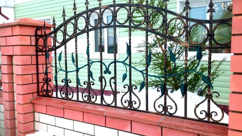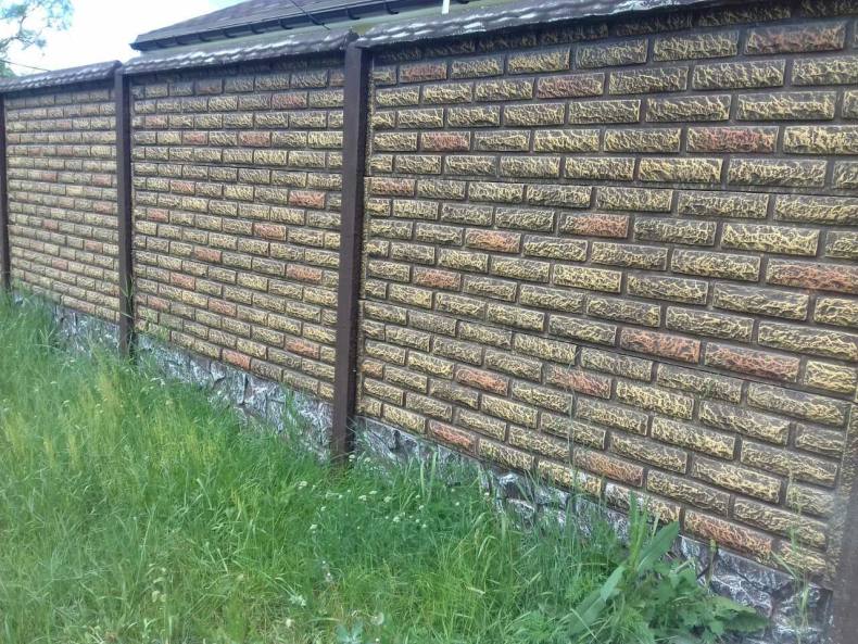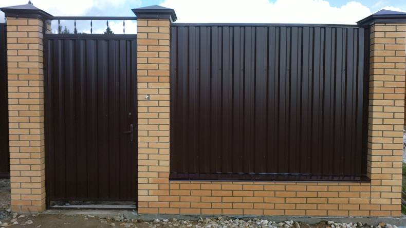 Металлопрофиль очень хорошо сочетается с кирпичной кладкой, помимо этого он имеет небольшую цену и не нанесет вред столбам.
