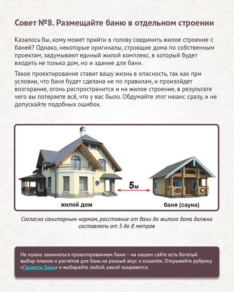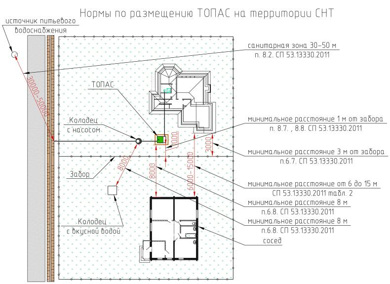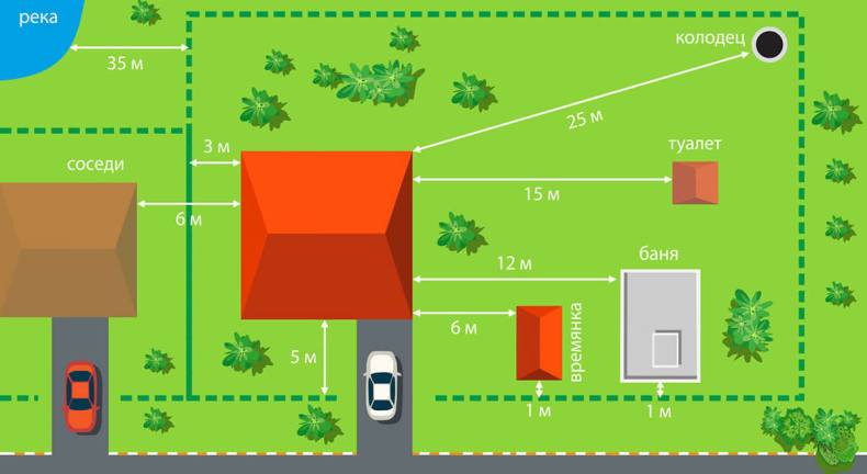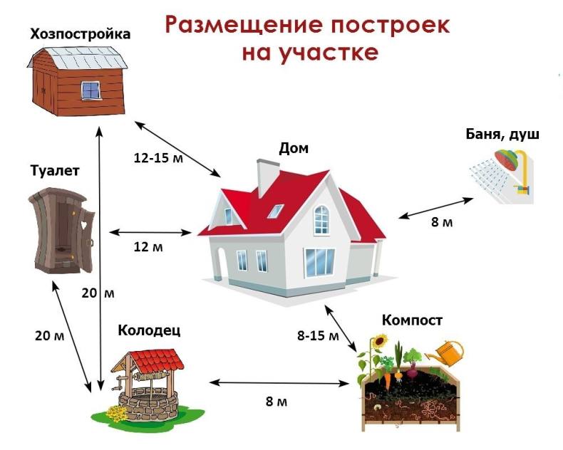 - Расстояние дополнительных сооружений от жилых не должно превышать 15 метров и 10 метров от колодца.