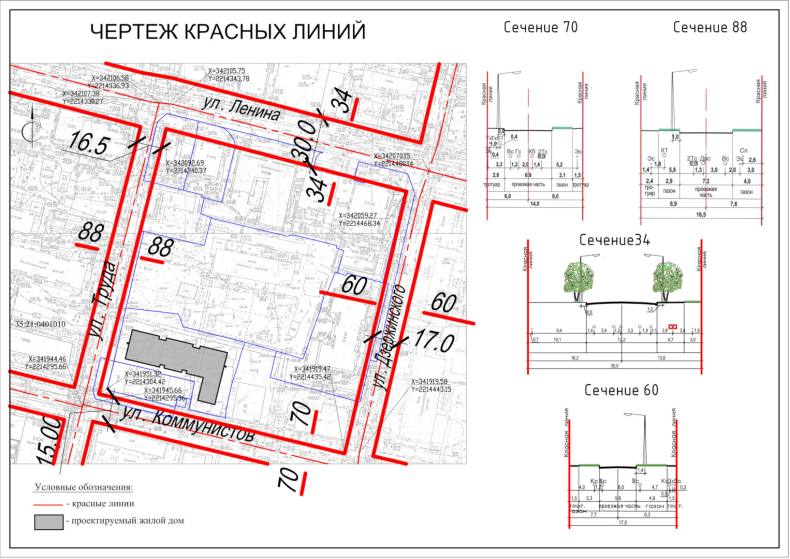 Красный цвет выбран не случайно. Этим цветом обозначаются границы участков. Для возведения различных сооружений градостроительными нормативами обозначаются наименьшие отступы от красной линии.
