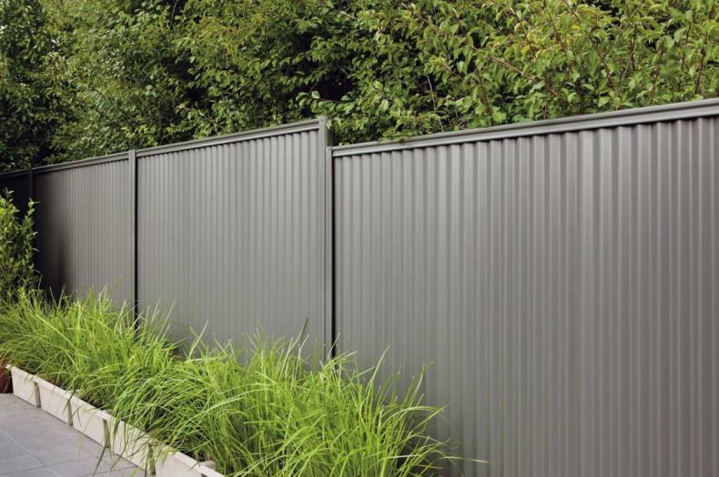 Длина панелей из профнастила составляет 2,5 м. При планировании расстояния между столбами ограждения следует также учитывать диаметр столба и зажима, фиксирующего панель.