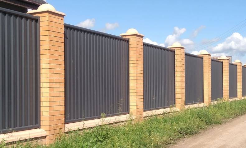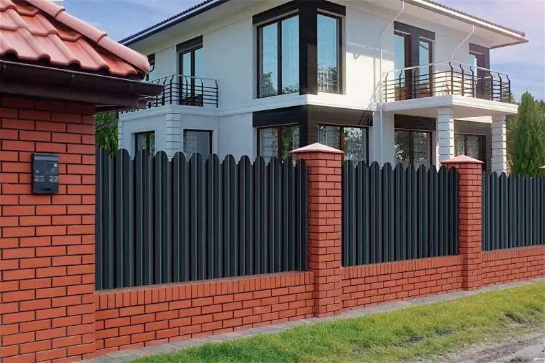- Кирпич. Помимо обычного красного и белого кирпича, есть огромное количество вариантов для декора, разных цветов и фактур. Ограда из кирпича всегда подходит к кирпичному дому из того же цвета с похожими элементами декора.