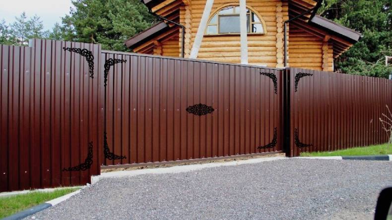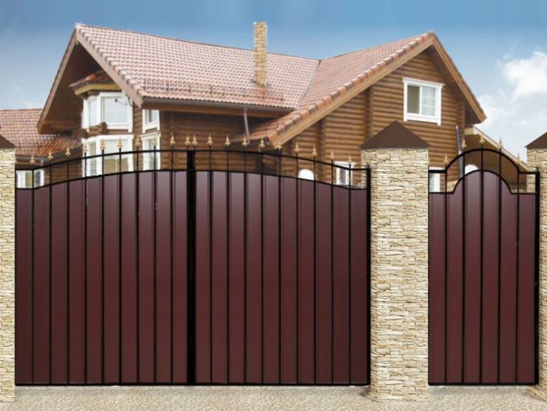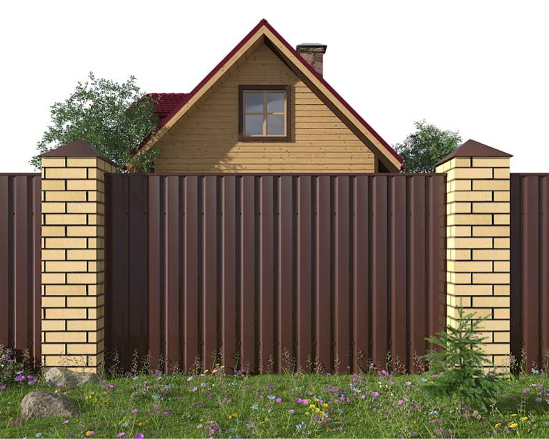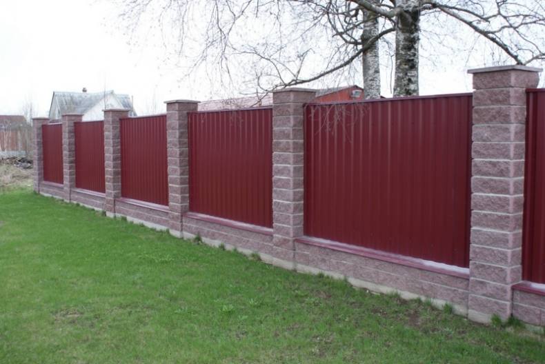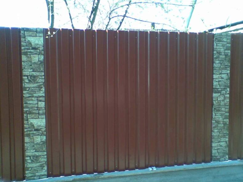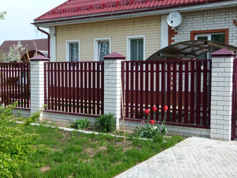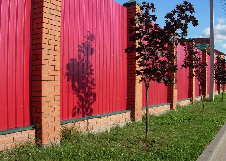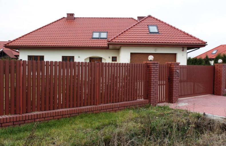 - Профнастил. Общепринятая рекомендация для выбора забора из данного материала – это цвета кровли гармонируют вместе с цветом ограды, при этом цвет крыши пресно сочетается с цветом фасада дома. Оптимальный цвет для профнастила – красный, так как он прекрасно сочетается с фасадом из камня или вместе с белой, либо серой штукатуркой.