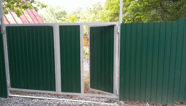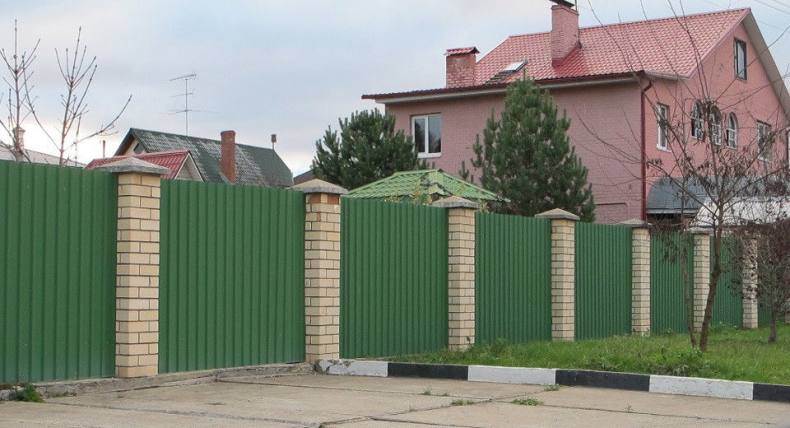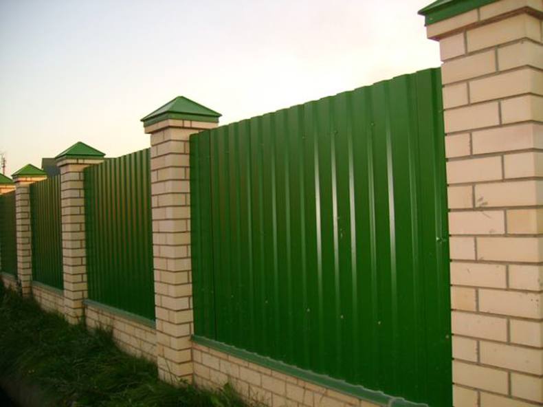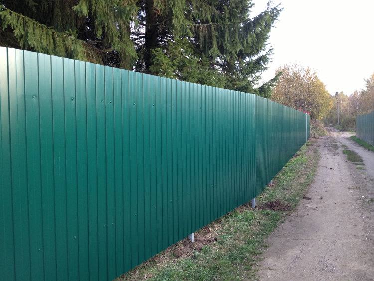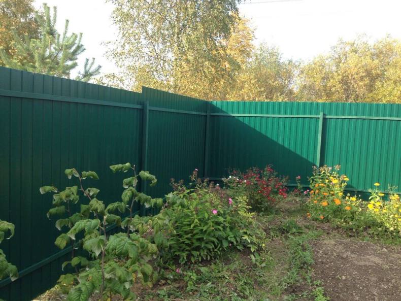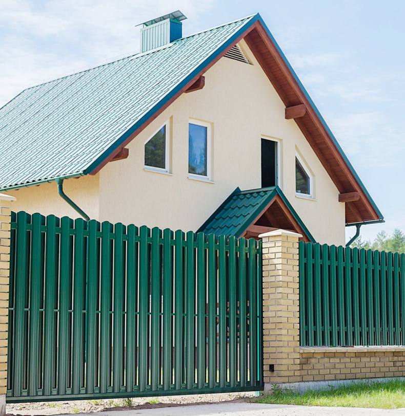 - Зеленый. Один из самых распространенных вариантов цвета для забора, который сочетается с окружающей зеленой растительностью.