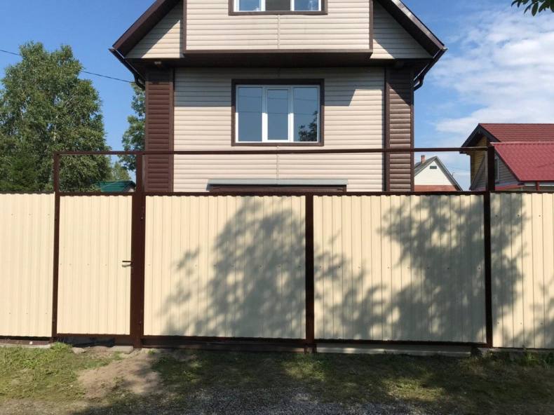 - Классическое цветовое сочетание – светлый верх с темным низом. Забор с кровлей и забор имеют светлый оттенок, а фасад – темный.