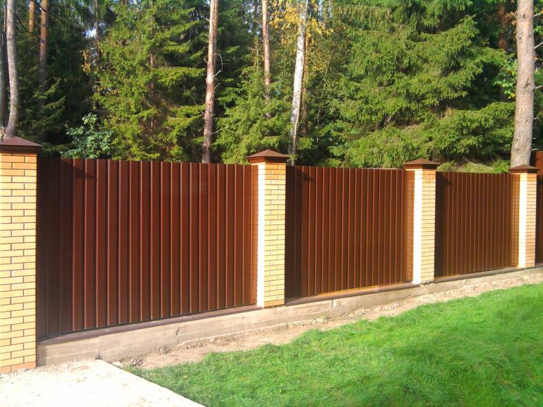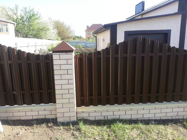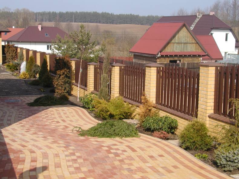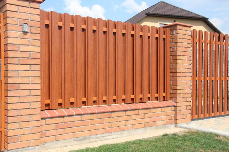 - Уходят недостатки отдельных материалов. К примеру, кирпич обладает большой прочностью и надежностью, однако стоит дорого и выглядит чересчур громоздко, если его слишком много. А вот кирпичные опоры в сочетании с секциями из профнастила или штакетника окажутся доступными по цене и привлекательными внешне;
