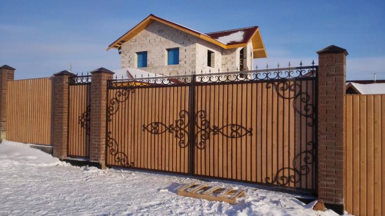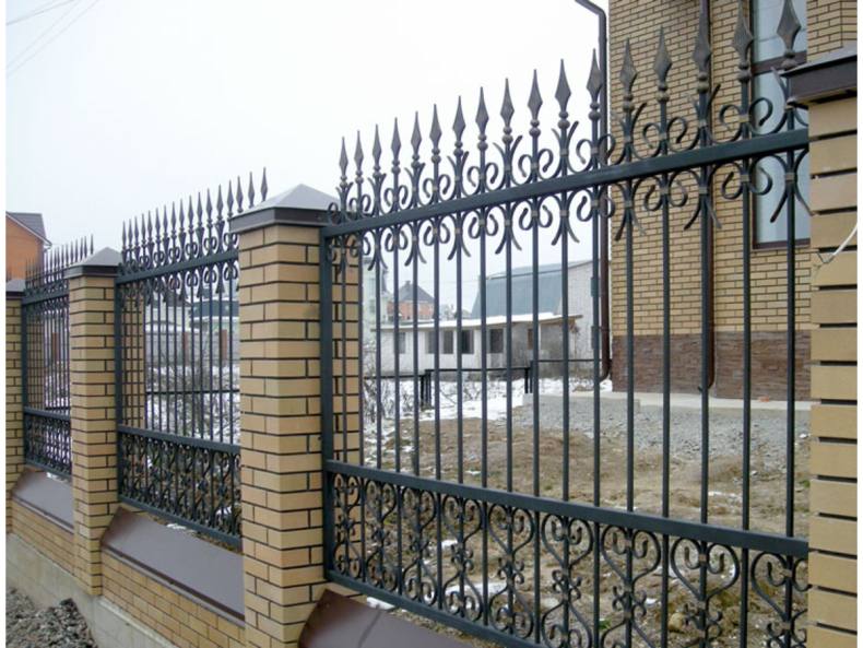 Секции к кирпичным столбам могут быть произведены из сетки-рабицы, дерева, штакетника, пластика или металла. Внешне любое сочетание будет выглядеть интересно и привлекательно. Набольшую популярность имеет комбинация кирпичных опор и кованых элементов.
