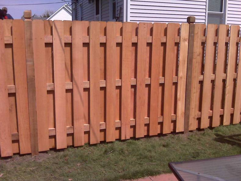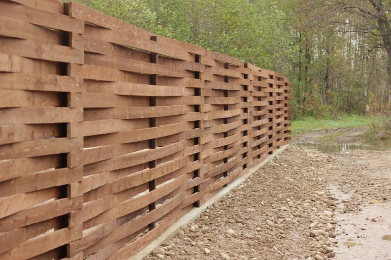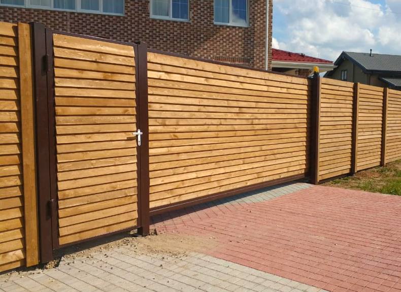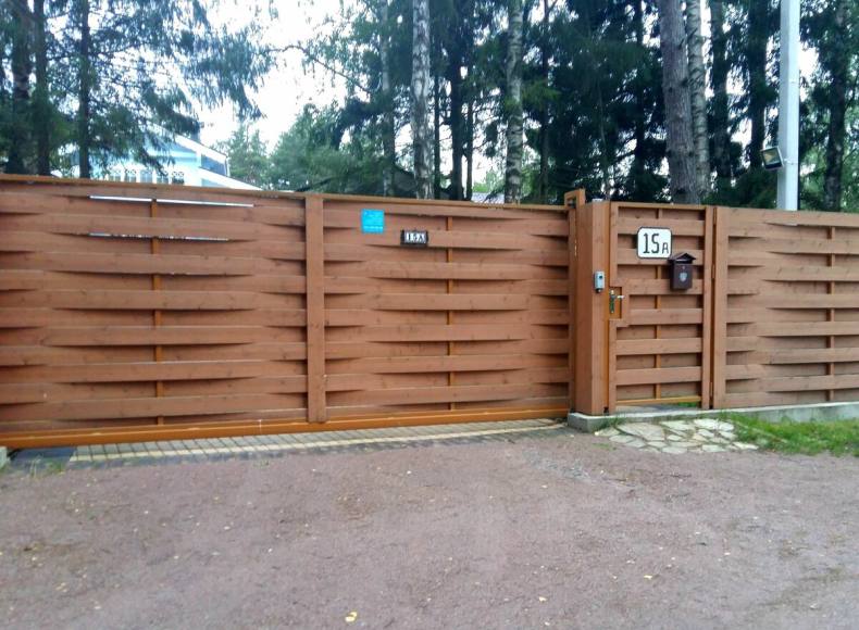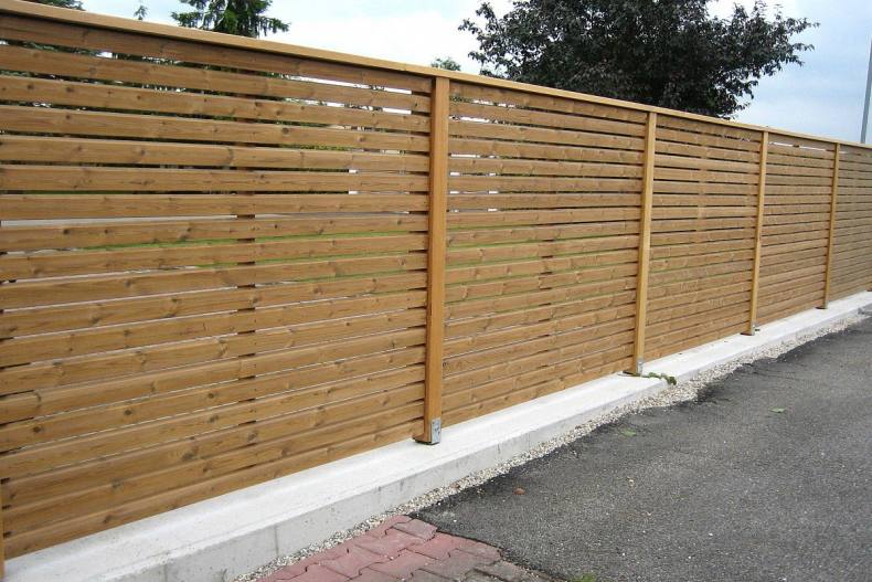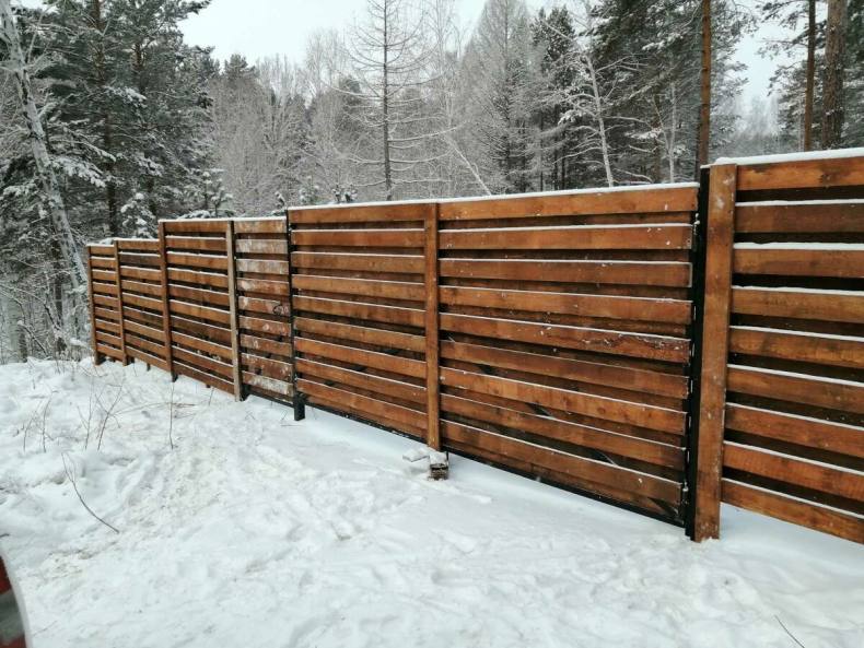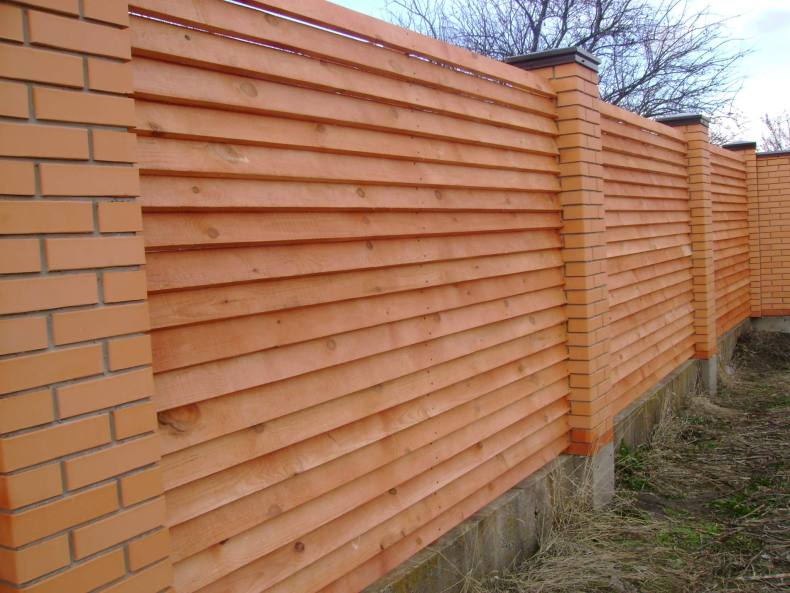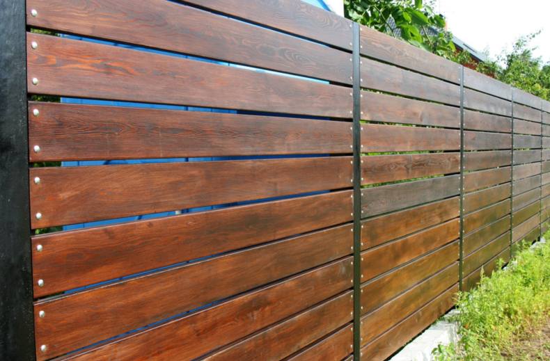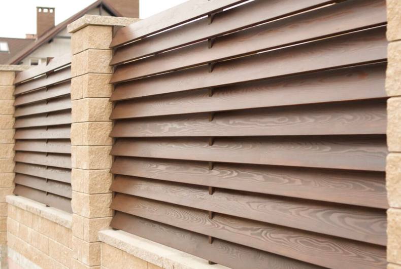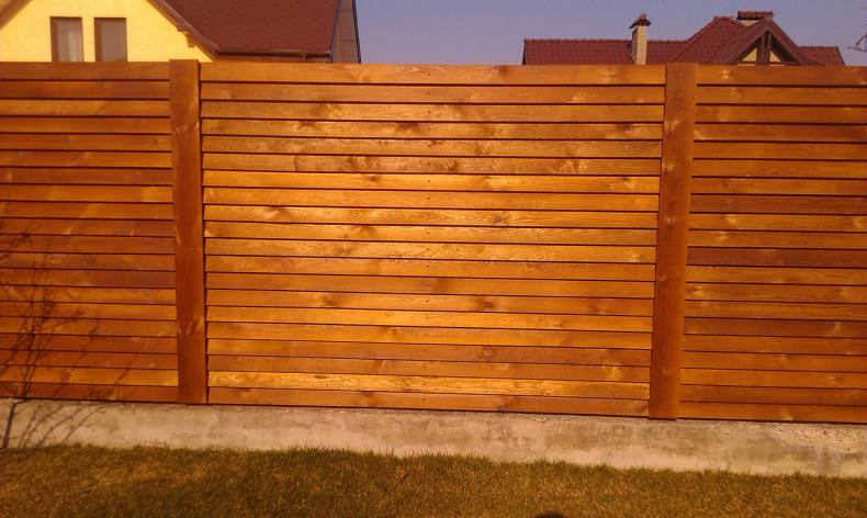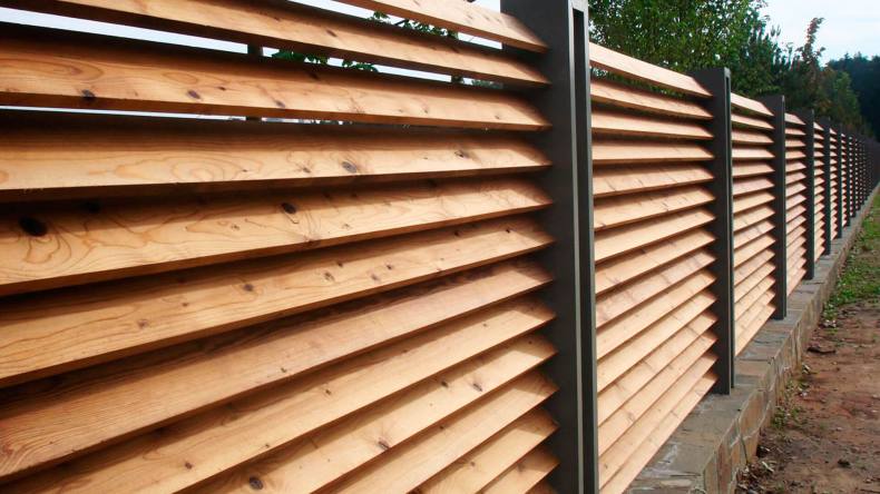 Такое ограждение часто называются американкой или лесенкой. С первого взгляда забор кажется монолитной стеной, но при более внимательном рассмотрении становятся заметны небольшие просветы, сквозь которые неплохо проходит воздух.