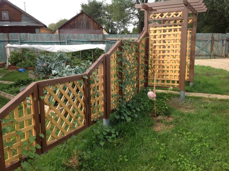 Полупрозрачная конструкция позволяет без труда рассмотреть все, что происходит на участке. Чтобы избежать нежеланных взглядов, такие заборы часто декорируют быстрорастущими лианами, которые добавляют ограждению дополнительное очарование.