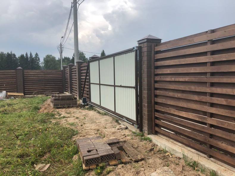 - Такой забор предоставит полную конфиденциальность всему проходящему на участке, хорошую пыле- и шумоизоляцию, но закроет часть территории от живительных солнечных лучей.