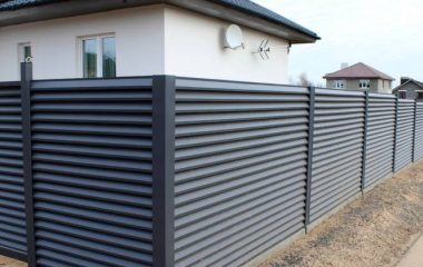 Ограда-жалюзи – это самый интересный и привлекательный заборный вариант. Он имеет отдельные секции, которые делаются из профилированных труб. К ним дополнительно крепятся горизонтальные панели. Отличается от других вариантов несложной установкой и высокими показателями качества. Из них получаются отличные ворота. Можно в этих целях использовать и сайдинг.