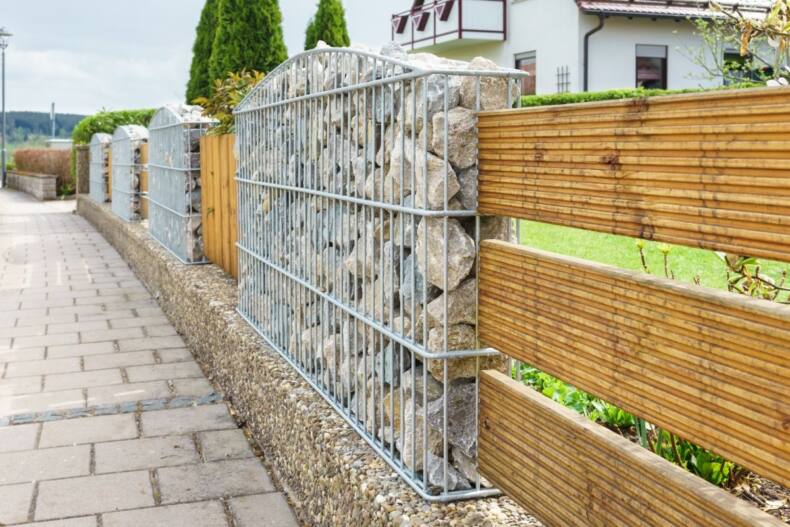 Габионы ― это металлическая оцинкованная сетка, внутри которой размещается щебень или крупная галька. Можно уложить камни, булыжники, валуны. На размер закладываемой фракции влияет сечение прутиков и размер ячеек, от чего и зависит цена конструкции. Такой забор может стоять без столбиков за счет собственного веса. Но под него требуется залить бетонное основание, ведь небольшая изгородь 3х0,3х0,6 м весит 1,5 тонны. Это предотвратит проседание в грунт.