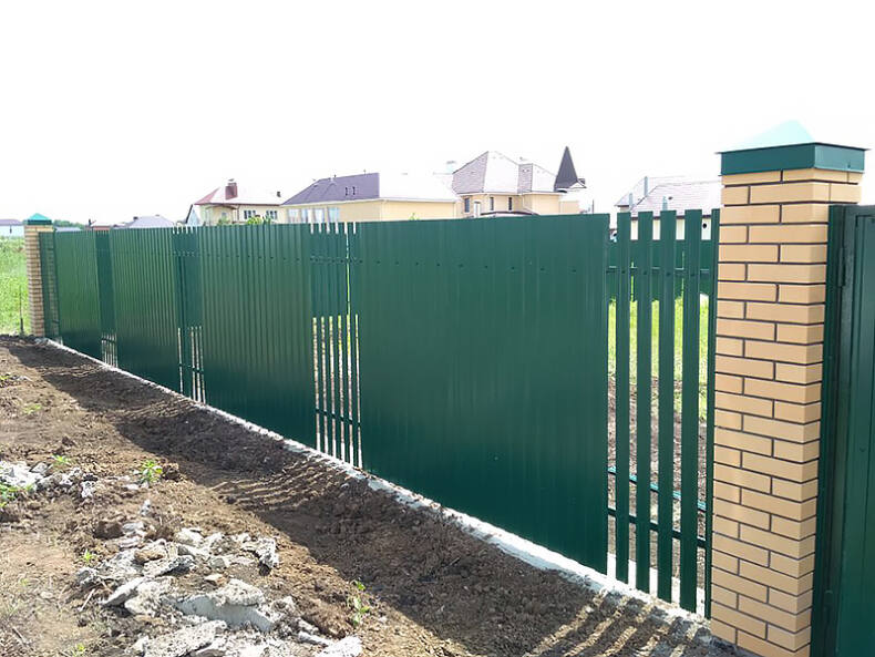 Тип забора из профлиста – это эконом-вариант. Профилированные стальные листы дополнительно обрабатывают цинком для улучшения показателей износоустойчивости. Ограждение выдержит любые климатические воздействия, пример его изображен на фото. Для ограды предпочтительно использовать профнастил С20.