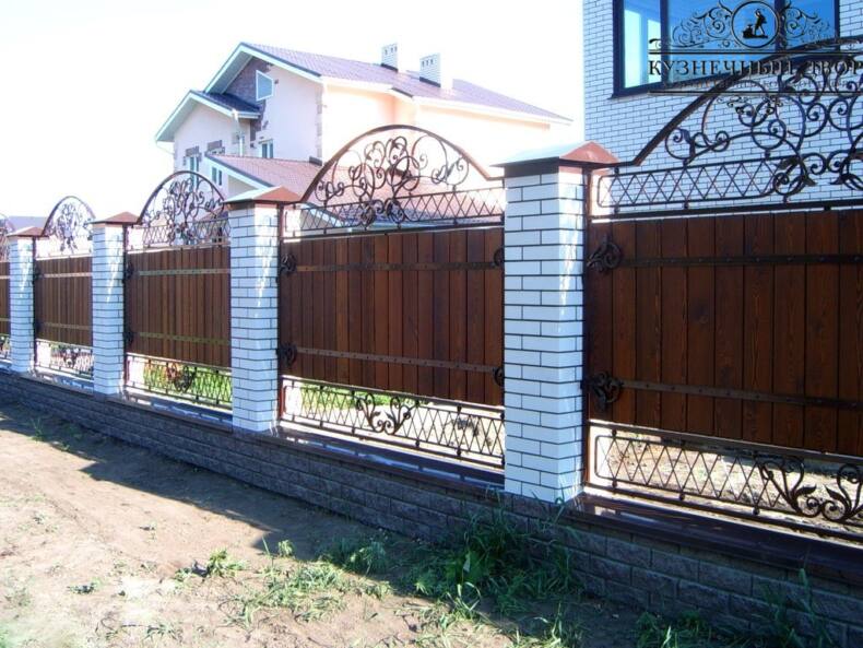 Самые красивые заборы и ограждения для дома получаются почему-то при использовании нескольких материалов. Чаще всего делают каменные или кирпичные столбы, а между ними уже устанавливают кованые элементы, деревянные или даже бетонные. Получается очень даже неплохо.