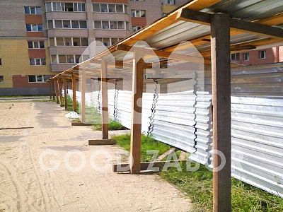 Еще один материал для установки ограждения – листы профлиста. При проведении работ по установке также необходимо вкопать деревянные столбы, сделать укосины и прибить прогоны.