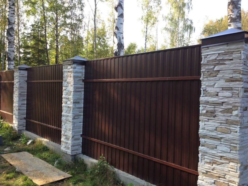 - Установление забора из профнастила, высота которого будет составлять около 2 метров – это отличный вариант для обустройства фасадной части или же тыльной стороны, выходящей на другую сторону улицы. Многие придерживаются мнения о том, что оптимальная высота такого ограждения должна составлять не менее 2,5 метров. Если в данном случае правильно обустроить дополнительные столбцы, можно достигнуть положительный эффект.