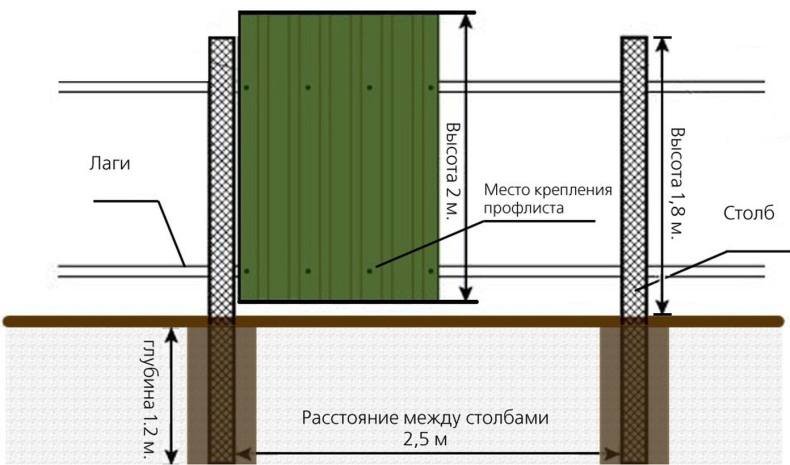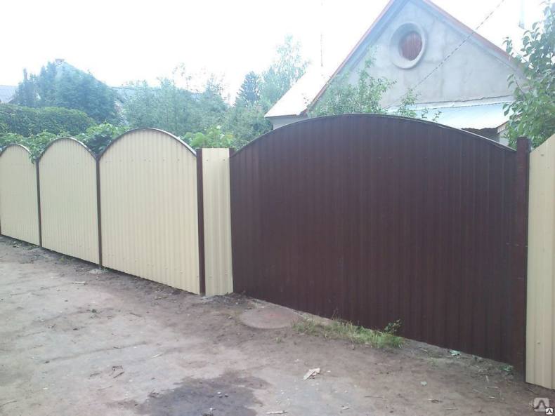 Стремясь подобрать наиболее оптимальный вариант, можно обратить внимание на профнастиле, удерживаемом при помощи двух столбов.
