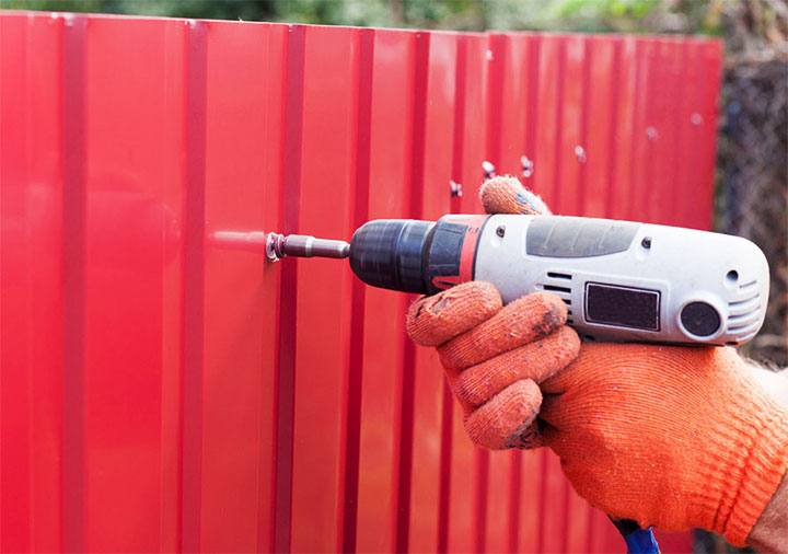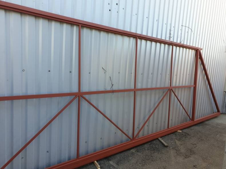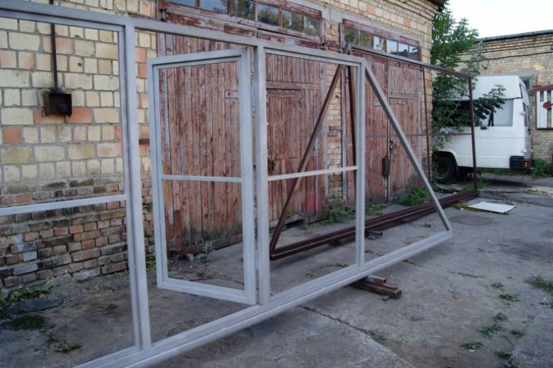- Обшивка каркаса. Это делается почти в конце работы. Накладывают профлист на раму и определяют размеры под вырезание. Сверлят отверстия для ручки оси под замок и для цилиндра. Края обрабатывают напильником.