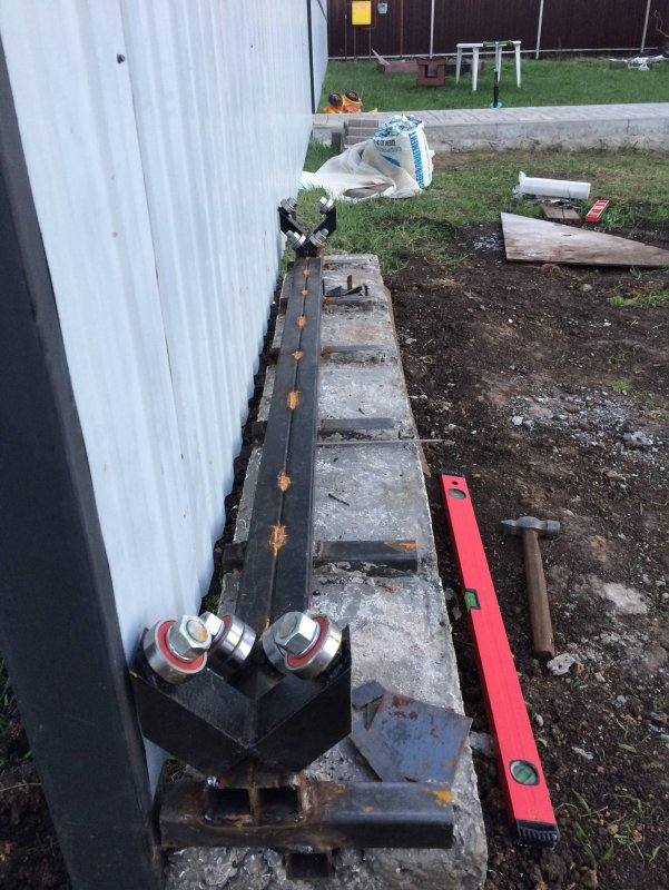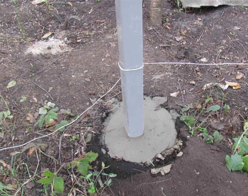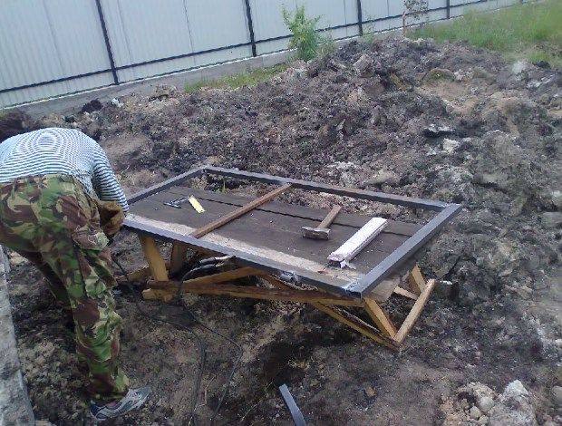 - Подготовка фундамента. Делается разметка для стоек и ям. Далее выкапывают или бурят ямы для стоек, при этом глубина должна превышать уровень промерзания грунтового слоя (в средней полосе РФ это 120 см). На дне засыпают песок, трамбуют в подушку до 10 см. Сверху засыпают щебень средней фракции высотой 20 см, трамбуют. В итоге общая глубина ямы должна быть не менее 150 см.Совет: оптимально приварить квадраты из стального листа для повышения устойчивости, устелить края ямы рубероидом, чтобы отделить бетон от влажной почвы.
