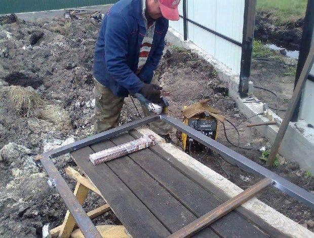 - Подготовка каркаса. Можно ставить ворота и забор сразу с калиткой или по отдельности. Совет: если это делается единовременно, легче выровнять все по одной линии. Отрезают кусок трубы нужного размера по углом в 45 градусов, перемычки – под углом 90 градусов. Все заусенцы зачищают и шлифуют для качественного шва.Сварку выполняют на ровном столе или площадке, под трубы подкладывают брус или лист ОСБ. Лучше проверить стыки труб по углами и диагонали, затем сваривают единым швом. Далее охлаждают каркас, переворачивают и сваривают другую сторону. Идет монтаж поперечин, швы потом закрашивают.