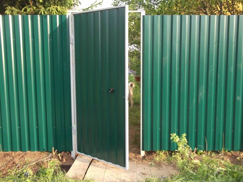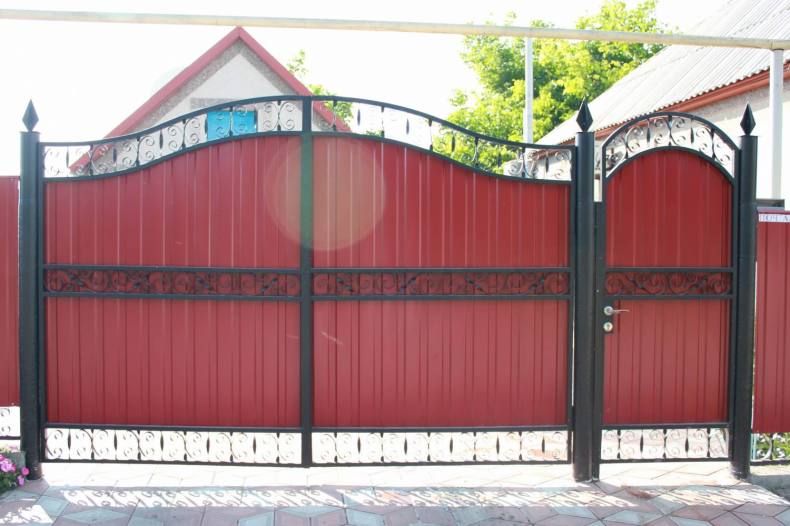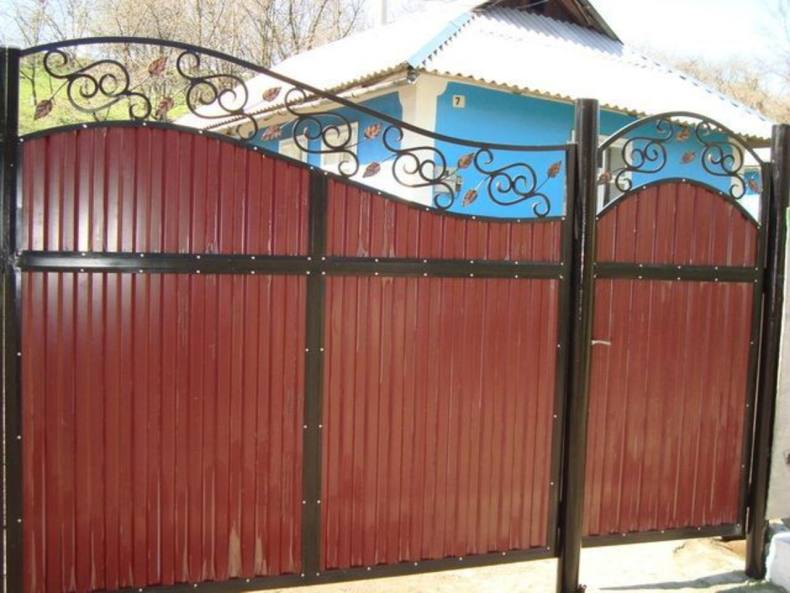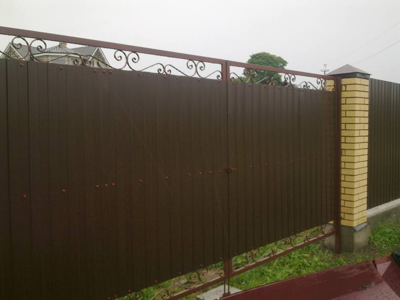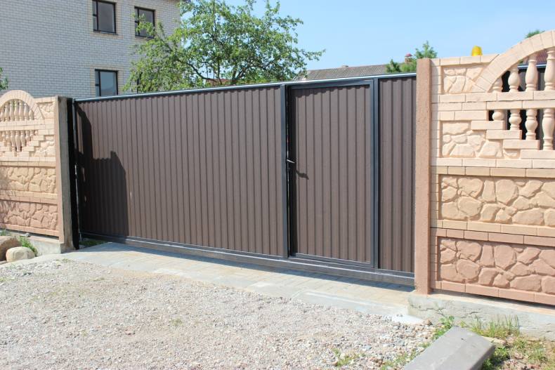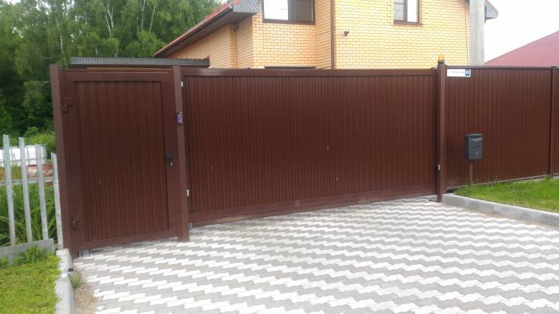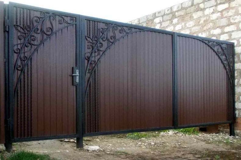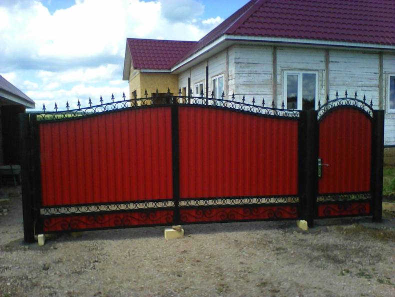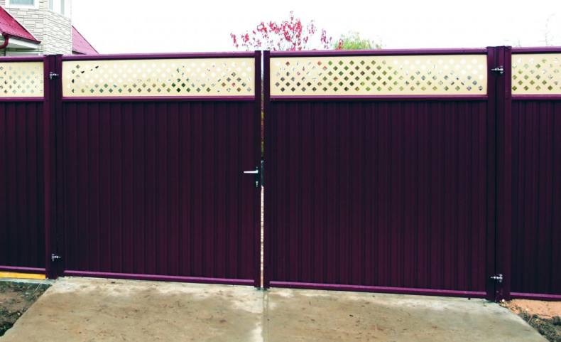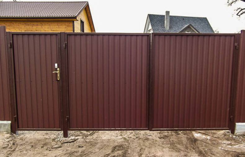Специфика материала в том, что, например, калитка из профлиста вполне может находиться либо рядом с воротами, либо отдельно от них. Сейчас не делают калитку внутри самих ворот – неэстетично и неудобно.