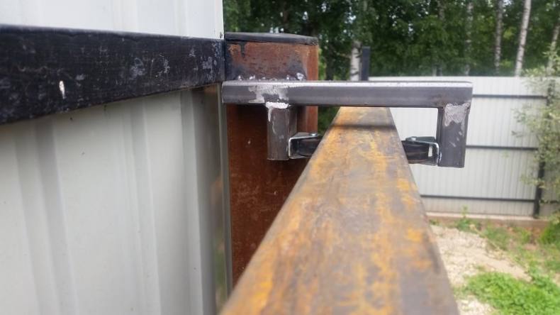 - Подвешивание замка или задвижки. Оптимально взять врезной замок, чтобы надежнее открывалась калитка. Сначала замеряют размер, выбирают место, делают прорезь болгаркой в трубе. Совет: важно закрыть замок от дождя и снега, поэтому стоит приварить кожух к каркасу.