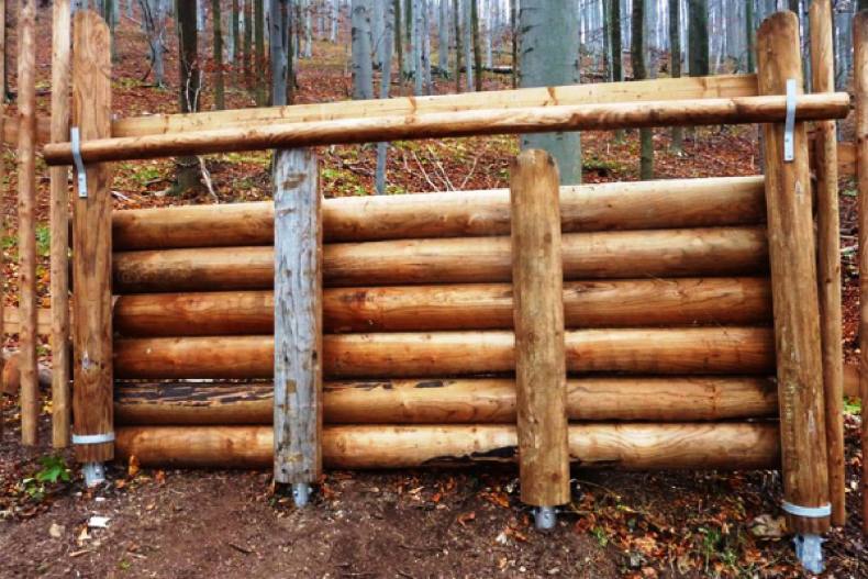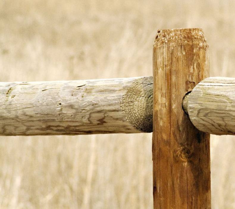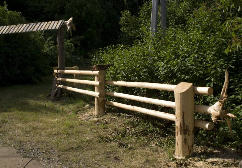Елочка — один из интересных вариантов возведения забора из бруса. В таком варианте, столбы размещаются так же как и в классическом, а вот поперечные бруски размещаются вертикально перекладин и внахлест. Затем между перекладинами размещаются калиброванные прокладки.