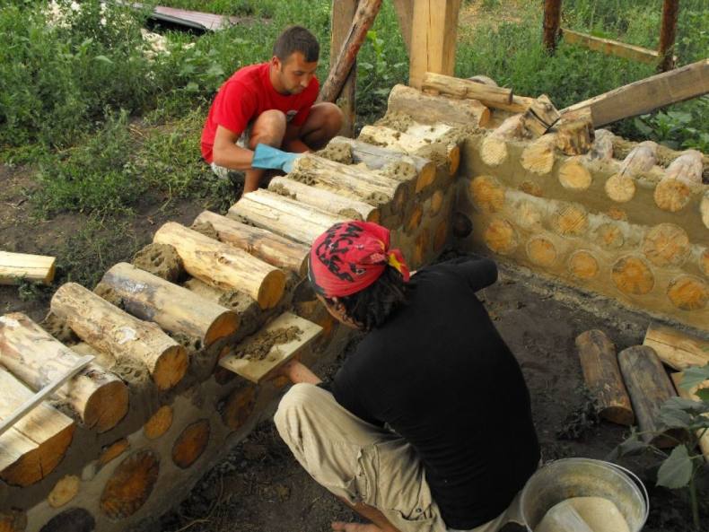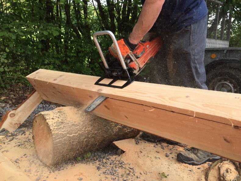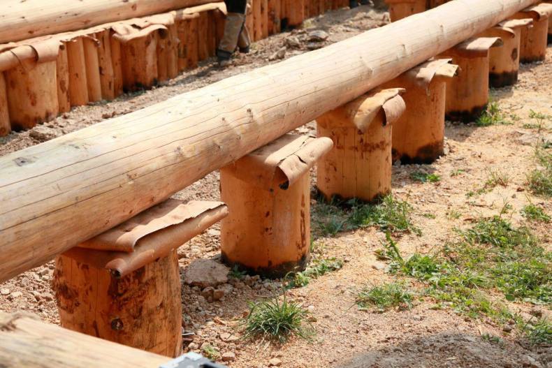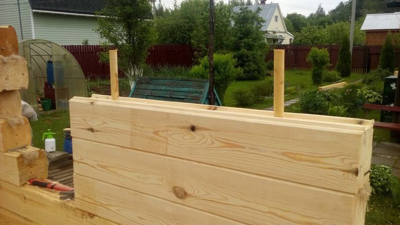 - Брус большой длины в данном способе выполняет роль горизонтальных прогонов, а короткие размещаются вертикально к прогонам, так чтоб не соприкасались с землей.