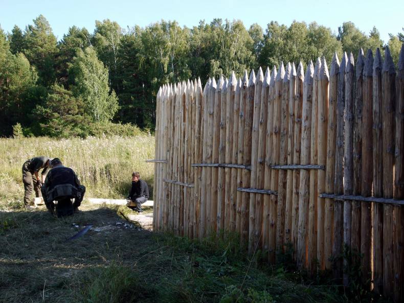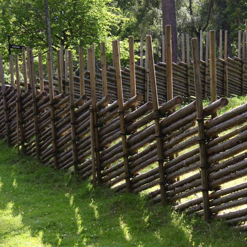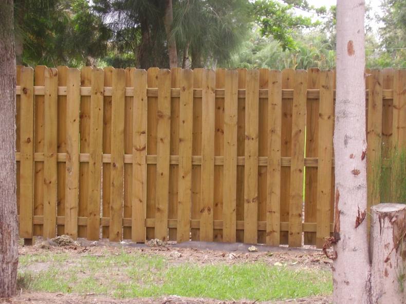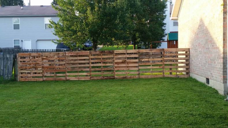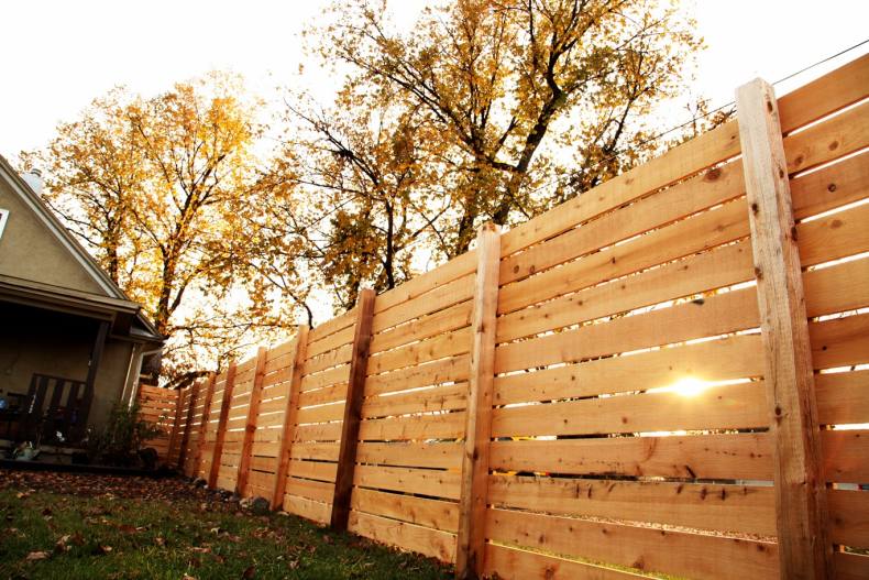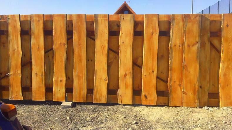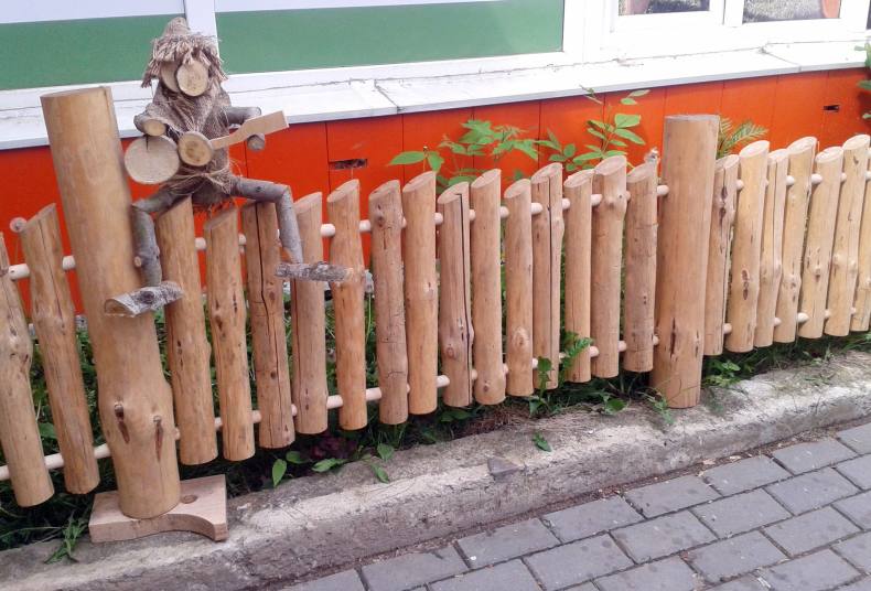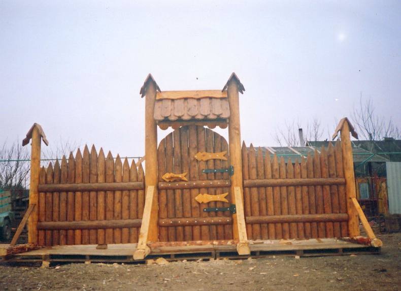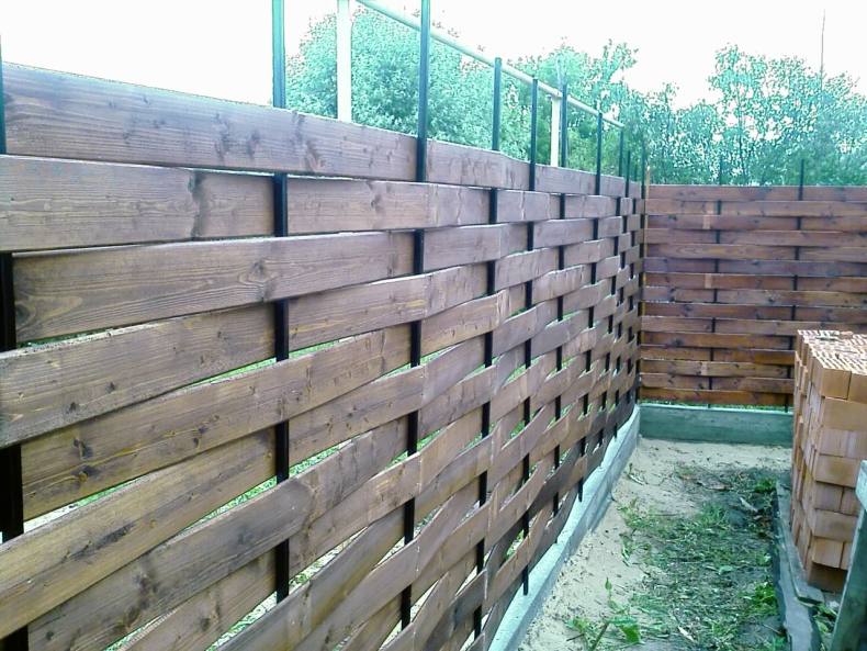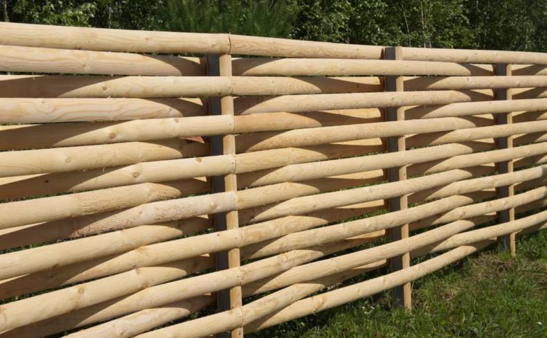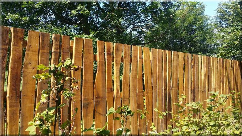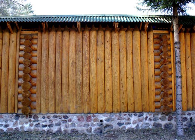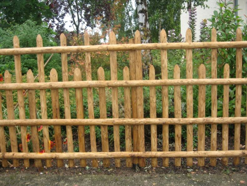Частокол — один из самых первых способов возведения забора, которые и сейчас широко применяется. В данном варианте, необходимо к поперечным перекладинам прибить бруса, при этом у них должны быть заострены концы.
