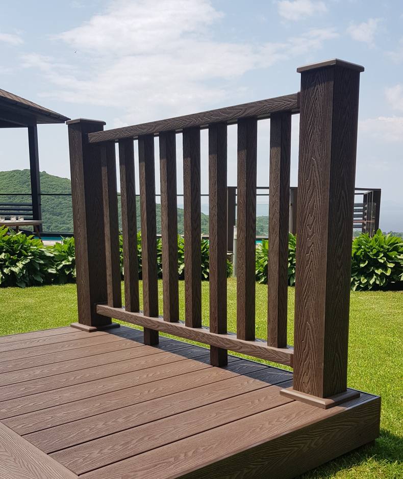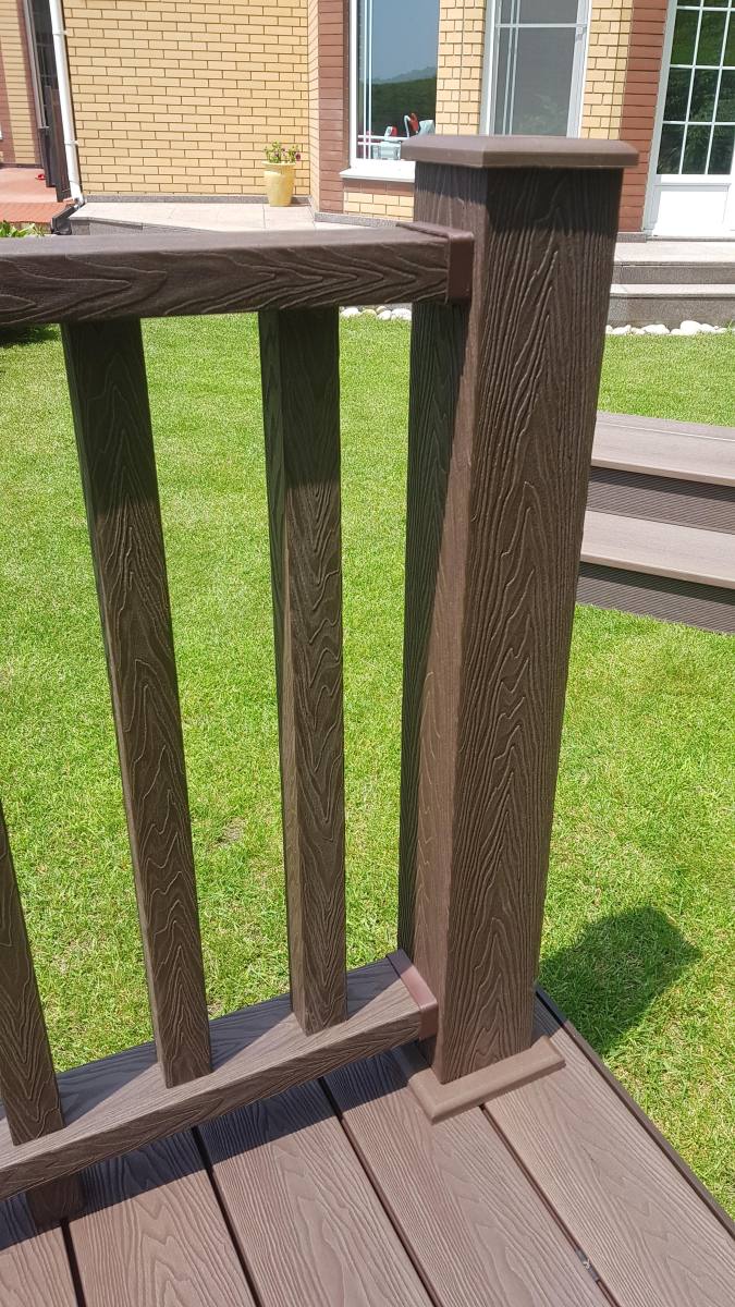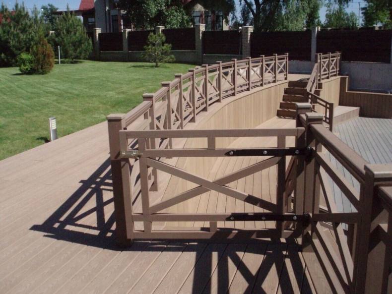 Ограждение из древесного полимера сохраняет красоту натурального дерева, его цвет и фактуру. Отличить искусственный материал от настоящей древесины по внешнему виду очень сложно, дополнительным плюсом такого оформления являются его светоотражательные свойства, которых нет больше ни у какого материала.