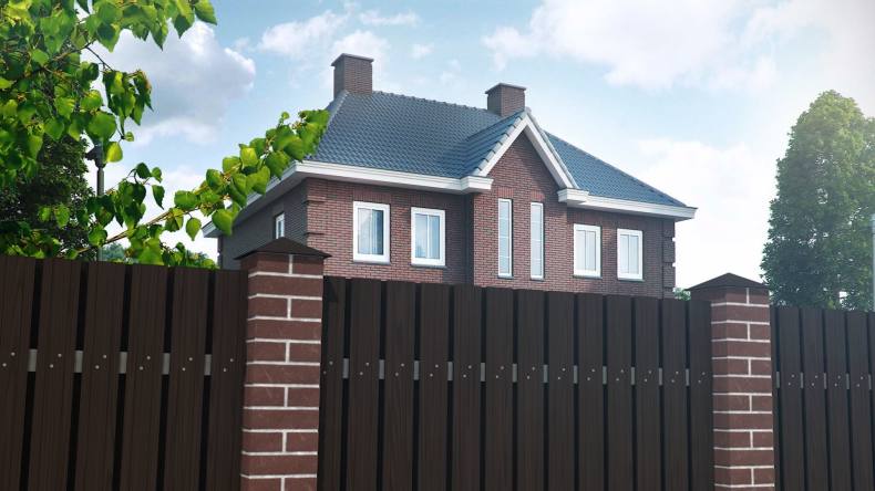 Прекрасный внешний вид забора из декинга наглядно продемонстрирует приверженность хозяев к классическому оформлению. При этом подобное ограждение может использоваться в совокупности с другими материалами, подчеркивая солидность кирпича или металла и легкое изящество дерева или пластика.