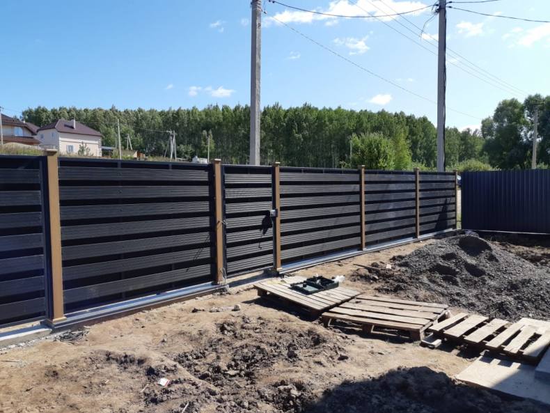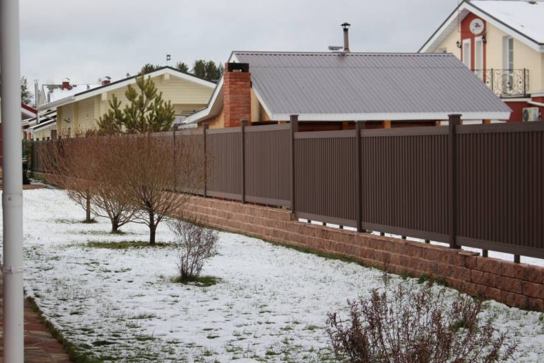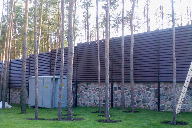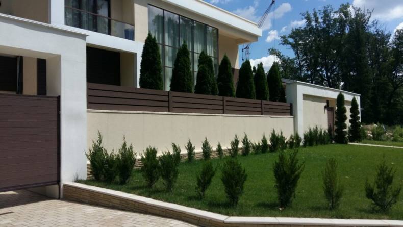 - Подобный забор обеспечивает полную конфиденциальность происходящего на участке, прекрасно защищает от ветра, пыли, шума, но ограничивает циркуляцию воздуха и поступление солнечного света.
