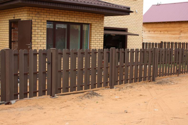 Еще больше воздуха и света обеспечит классическое ограждение в виде вертикально установленных досок. Чем меньше будет расстояние между отдельными элементами, тем хуже будет видимость происходящего на участке с улицы.