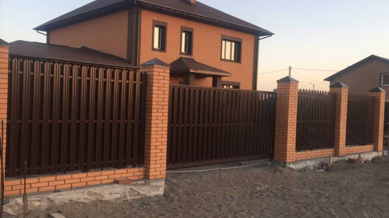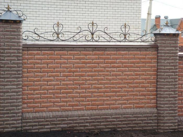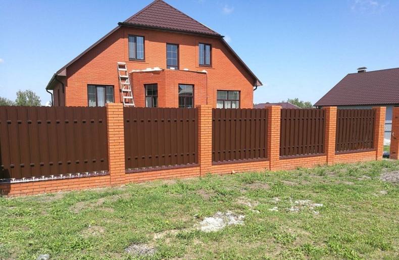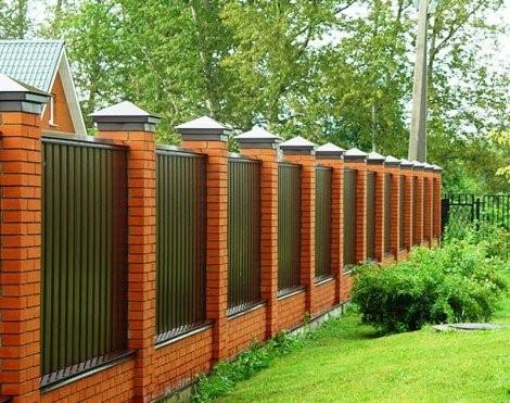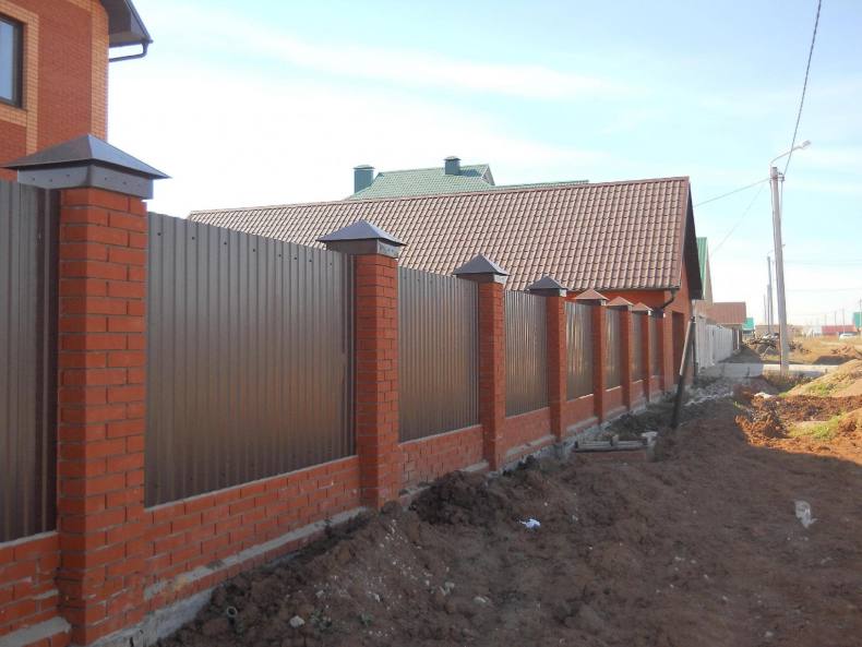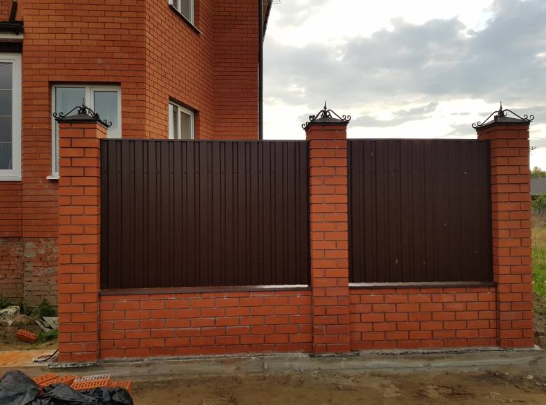 Неплохо сочетаются между собой профилированный стальной оцинкованный лист и кирпичи. Ещё один весомый плюс такого ограждения – оно недорогое.